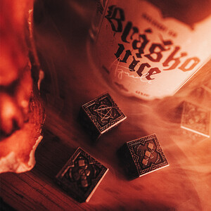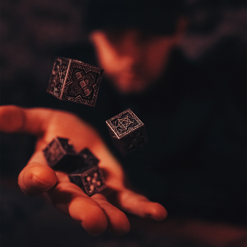 Šest kovových kostek – pět potažených stříbrem a jedna zlatem, neb i mezi válečníky bývá jeden král. Každá nese Agraelův znak a místo čísla šest uvidíš pentagram.