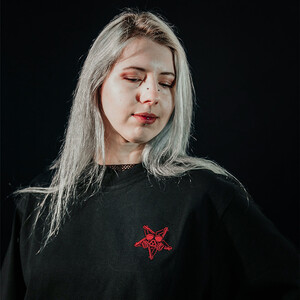 • Pentagramová výšivka na srdci ČERVENOU BARVOU