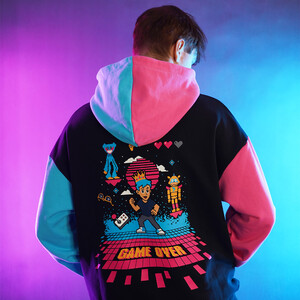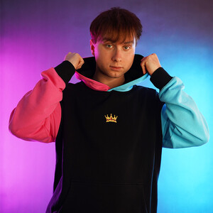 Prémiová mikina od youtubera Ikona tě nenechá zapadnout. Je to originální kousek, který kombinuje černý základ s růžovým a modrým rukávem a kapucí rozdělenou na dvě barvy – jedna půlka růžová, druhá modrá. Na hrudi tě čeká zlatá výšivka korunky a na zádech velký potisk s herní tematikou, který ti připomene Ikonův styl i mimo obrazovku.