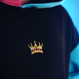 Prémiová dětská mikina od youtubera Ikona tě nenechá zapadnout. Je to originální kousek, který kombinuje černý základ s růžovým a modrým rukávem a kapucí rozdělenou na dvě barvy – jedna půlka růžová, druhá modrá. Na hrudi tě čeká zlatá výšivka korunky a na zádech velký potisk s herní tematikou, který ti připomene Ikonův styl i mimo obrazovku.