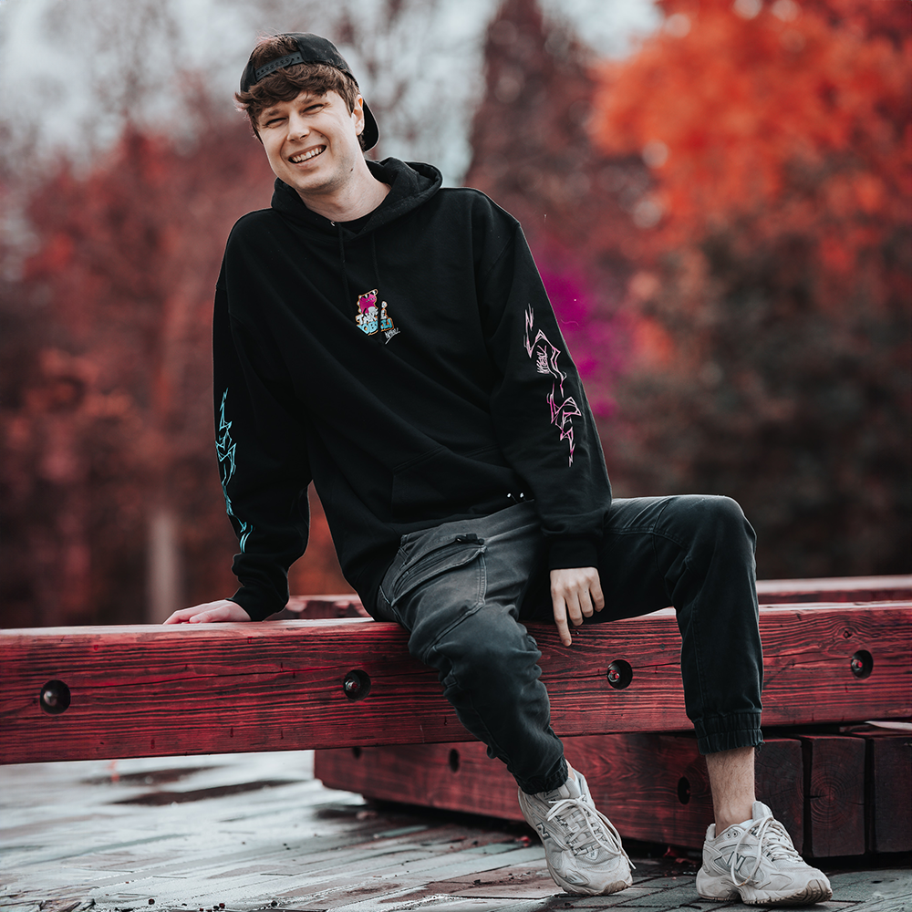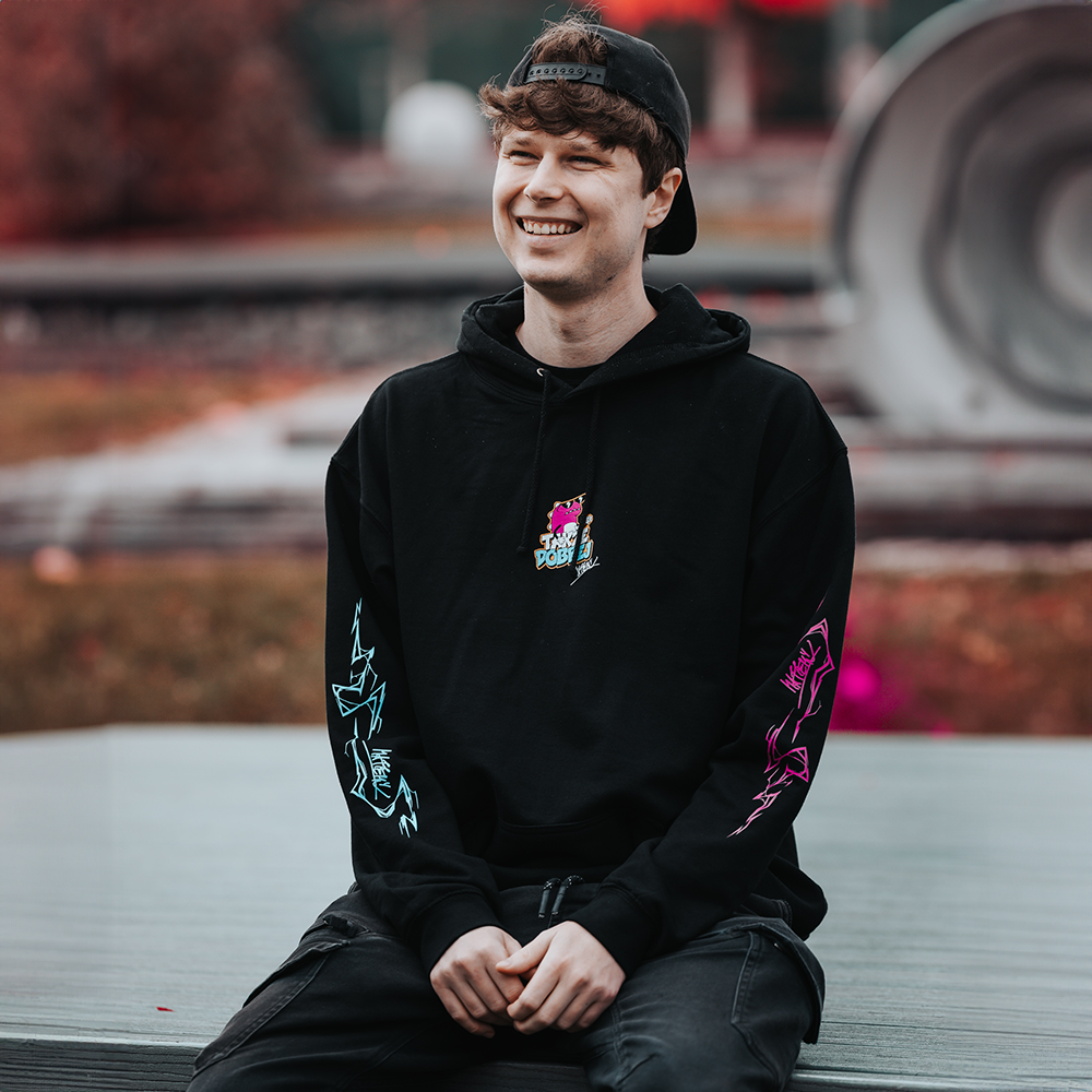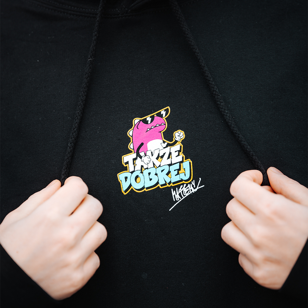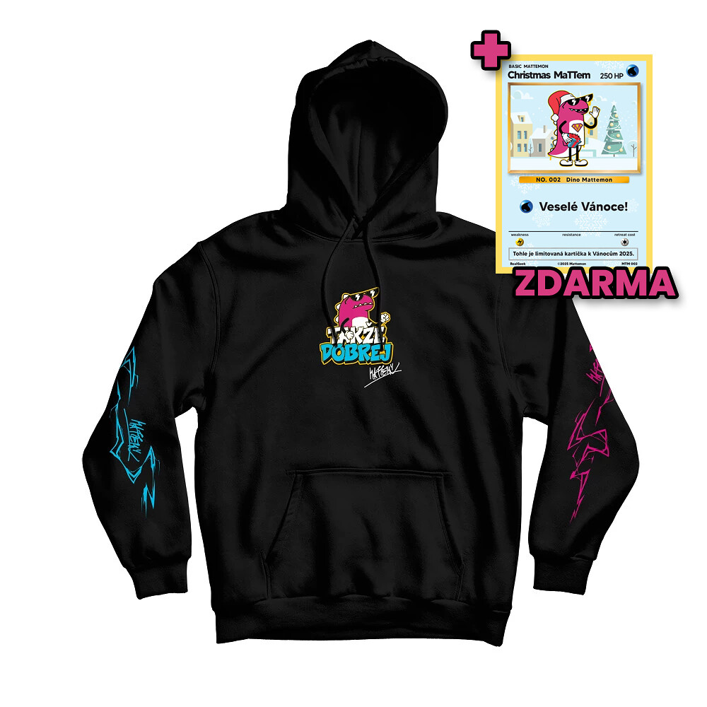 Černá oversized mikina s typickým Mattemovým Dinem a nápisem Takže dobrej ti dodá vibe, který nejde přehlédnout. Extra cool jsou růžovo-modré čáry na rukávech – totální pecka, co přitáhne pohledy. Tahle signature mikina je must-have pro každého, kdo chce být v teple a stylu zároveň.