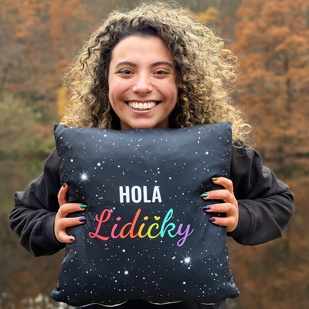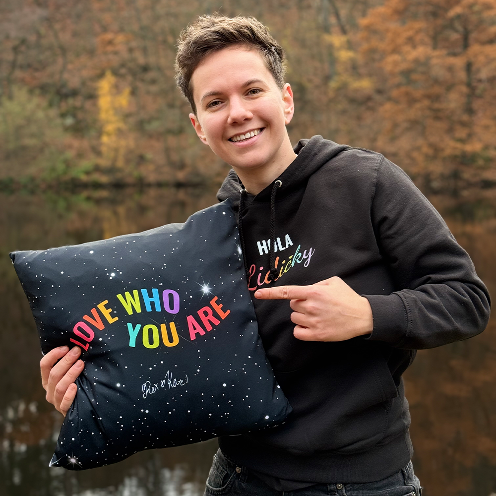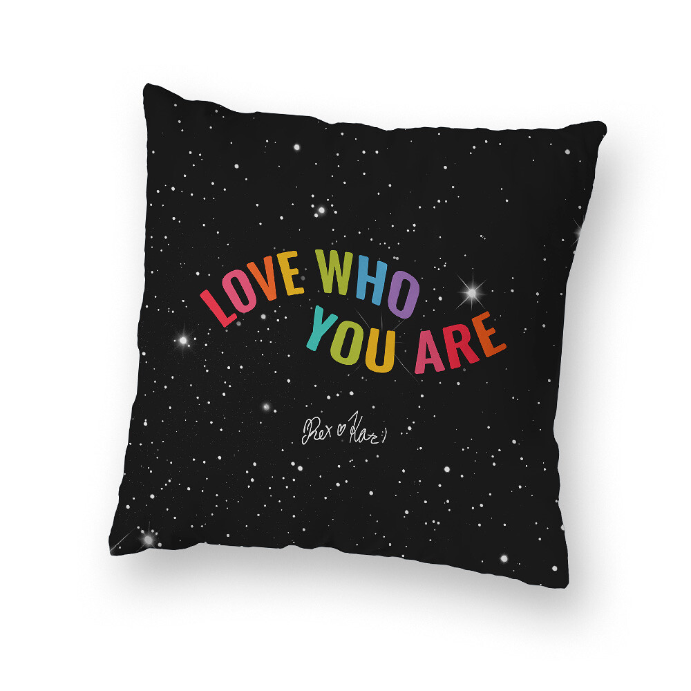 Chceš mít doma kousek radosti od Rex & Kate? Tenhle černý polštář je přesně to, co ti připomene, že milovat sám sebe je bomba. Na jedný straně tě podpoří duhovým nápisem Love who you are, na druhý tě pozdraví svým Hola lidičky. Všude okolo? Hvězdičky, jako že tohle je prostě čistá pozitivní energie na gauč.