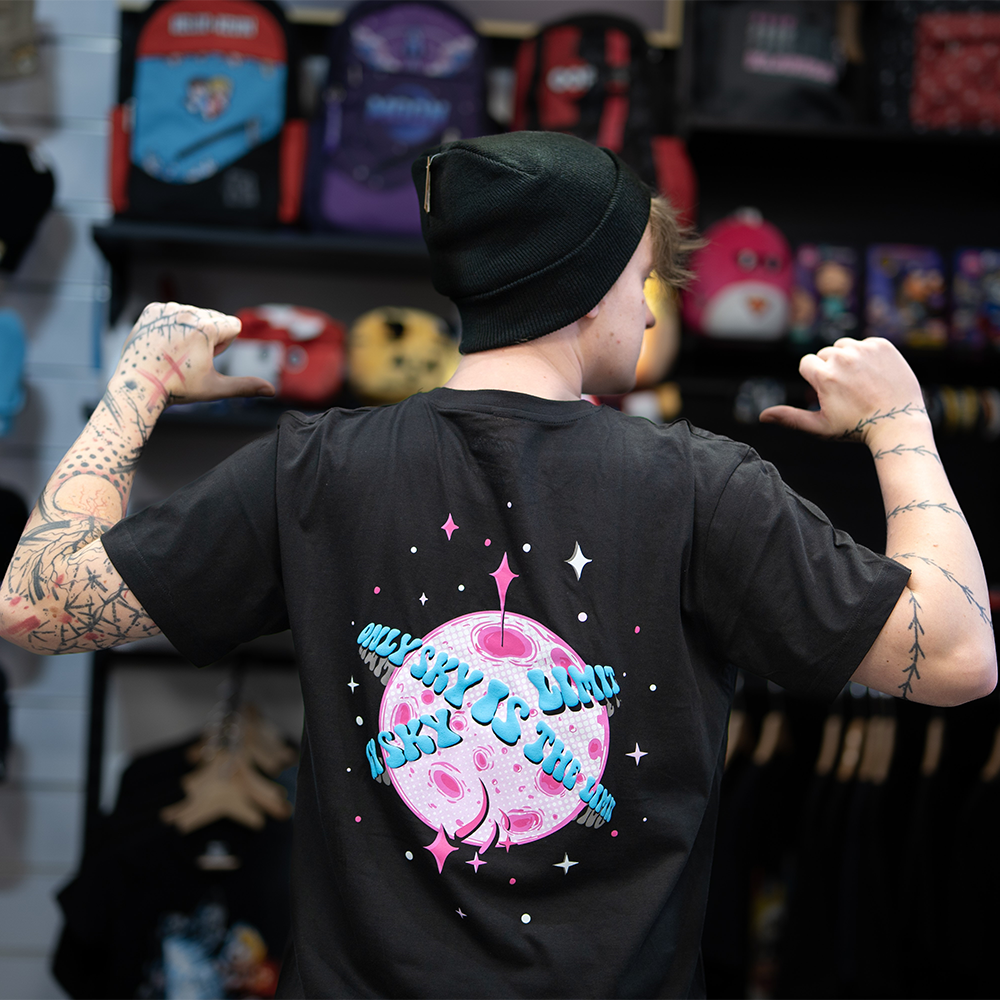 Tričko z limitované kolekce inspirované sny, odvahou a představivostí. Na první pohled jednoduché, ale s vesmírnou energií - nápis MOON na hrudi a růžový měsíc s mottem Only sky is the limit! na zádech. Modré detaily jsou vytištěny prémiovou technikou puff print, která dodává potisku jemný 3D efekt a originální vzhled.